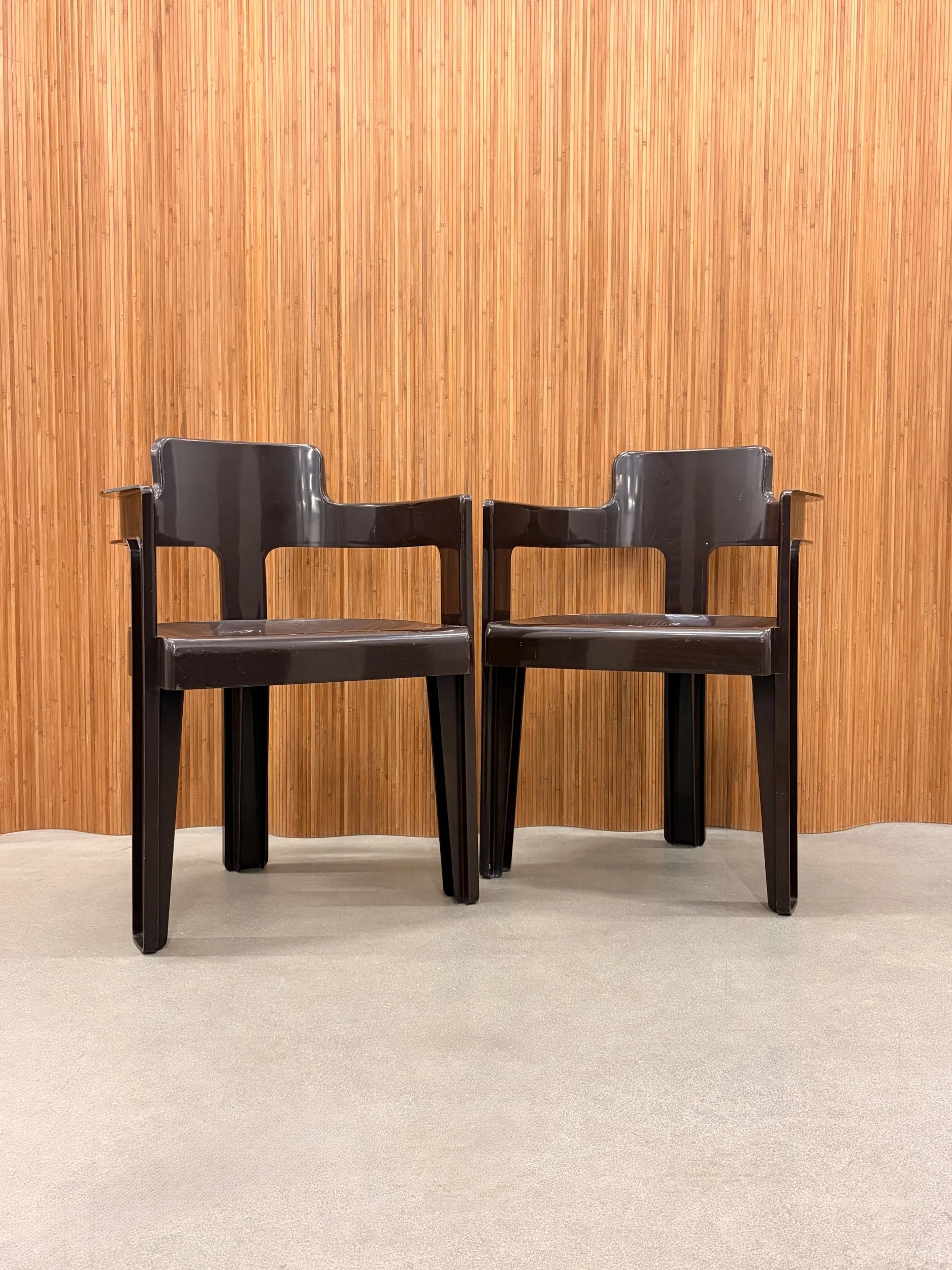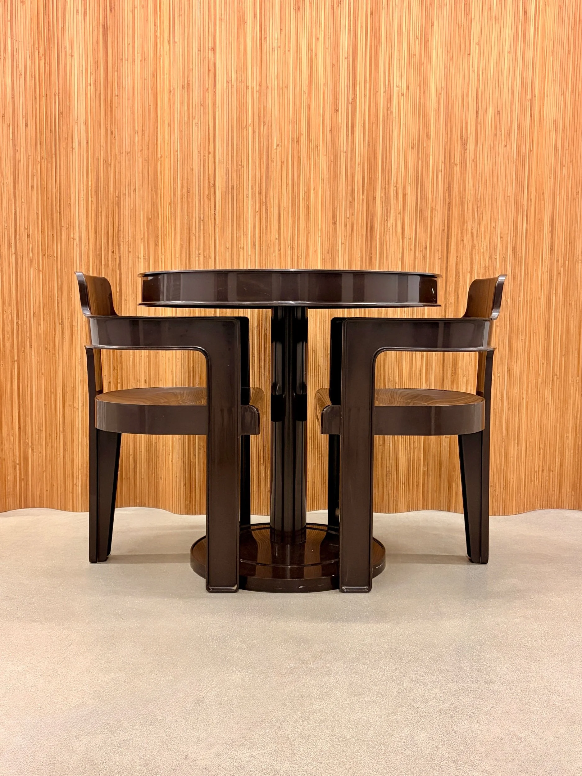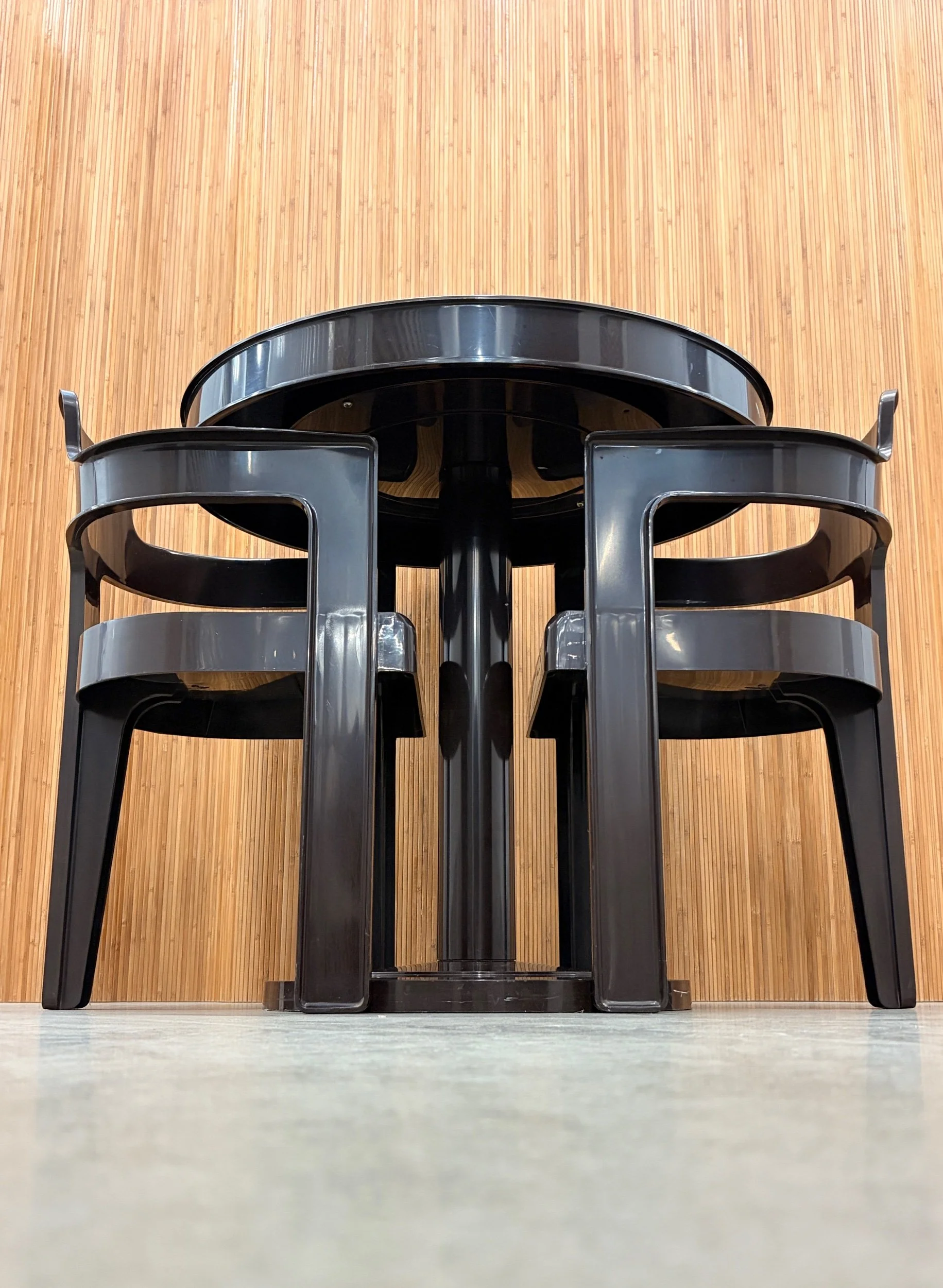 beautiful 1960’s syroco space-age dining set in a rich deep-brown molded plastic. features sculptural curves, bold silhouettes, and that glossy retro finish that defines the atomic-age era. the pedestal table anchors the set with a clean round profile, while the matching chairs tuck in seamlessly — equal parts functional and futuristic.