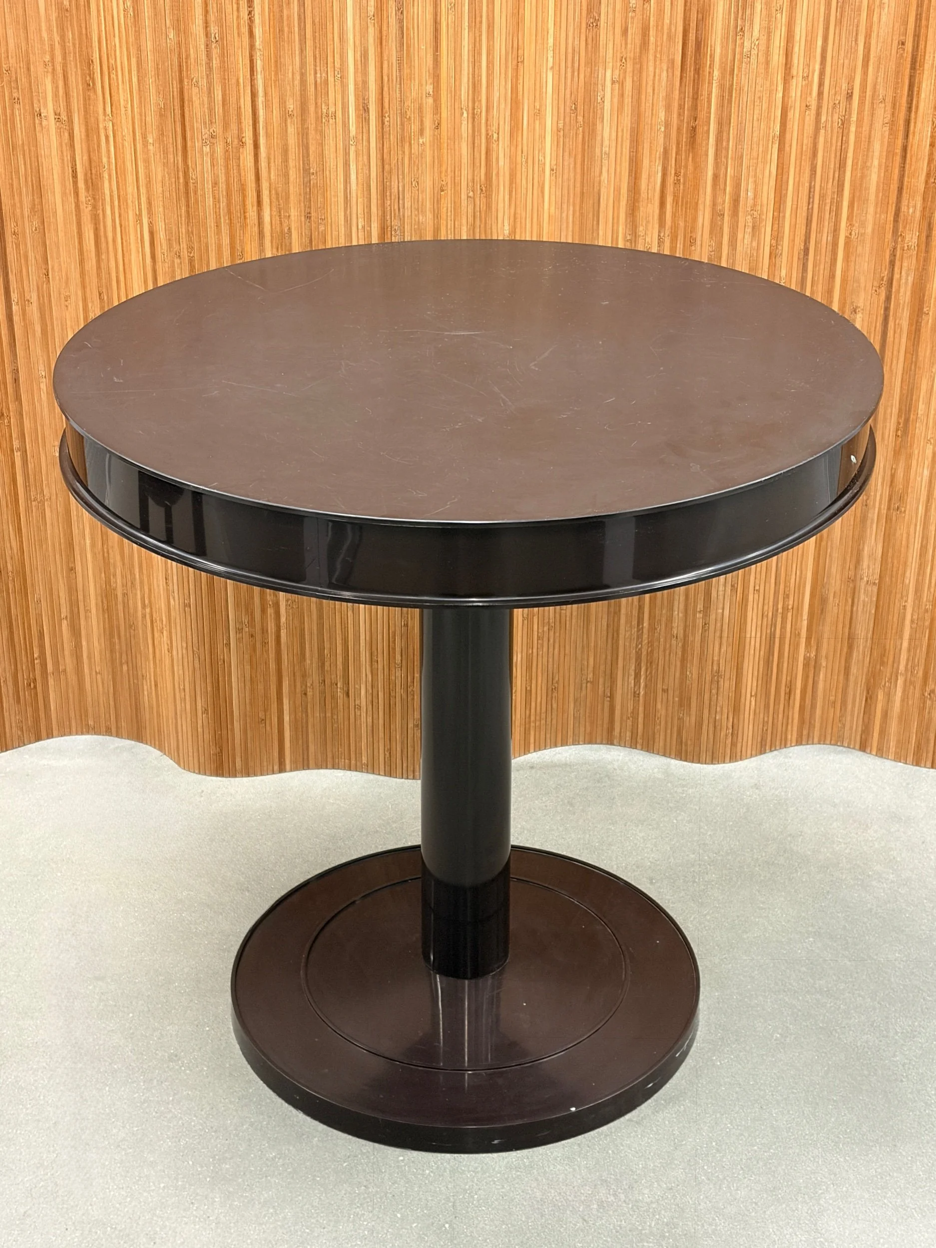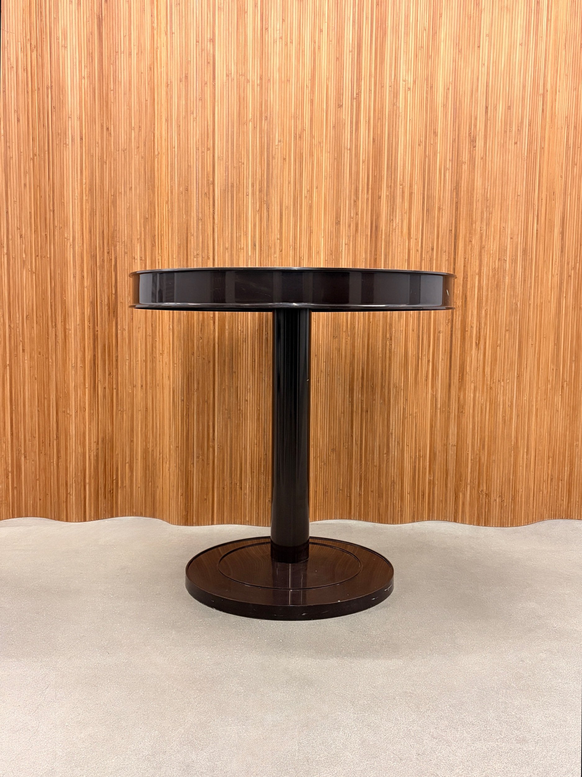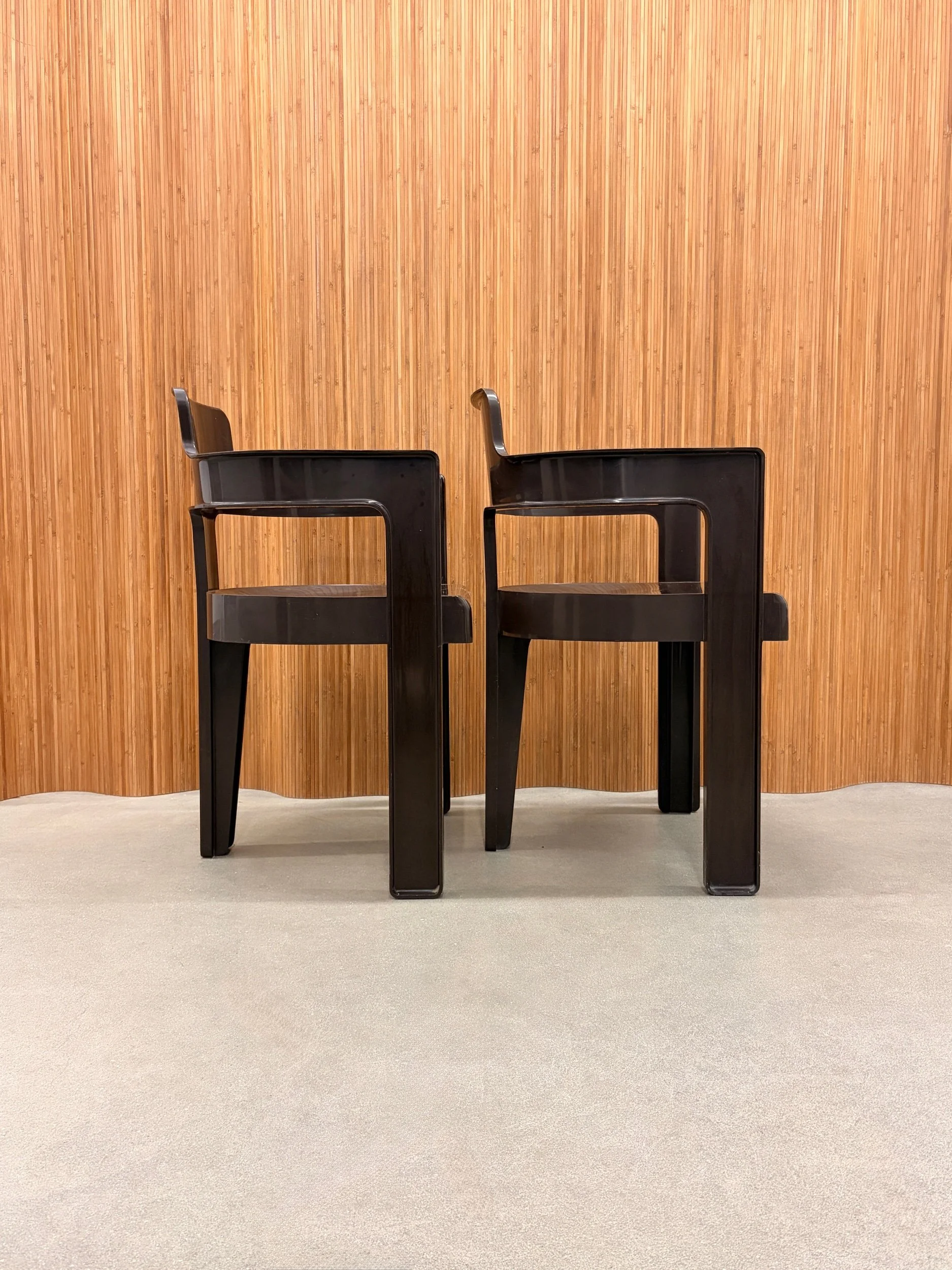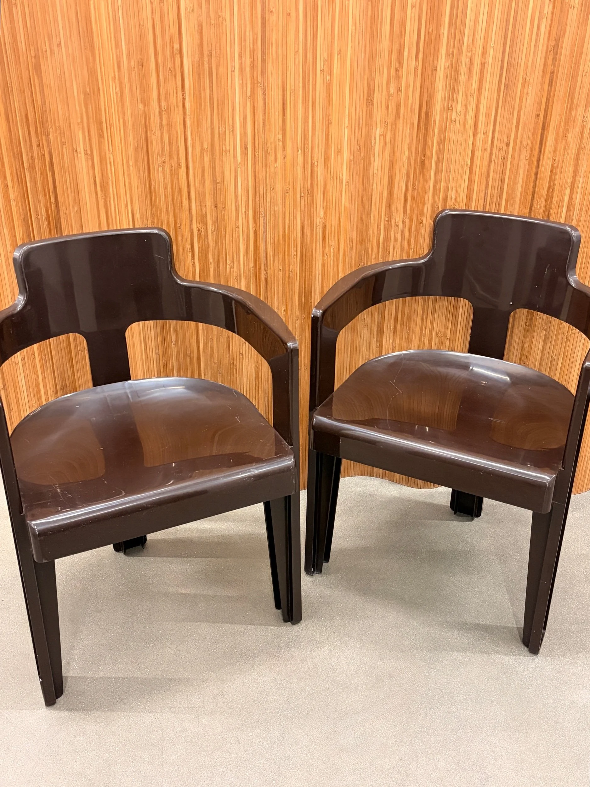 beautiful 1960’s syroco space-age dining set in a rich deep-brown molded plastic. features sculptural curves, bold silhouettes, and that glossy retro finish that defines the atomic-age era. the pedestal table anchors the set with a clean round profile, while the matching chairs tuck in seamlessly — equal parts functional and futuristic.